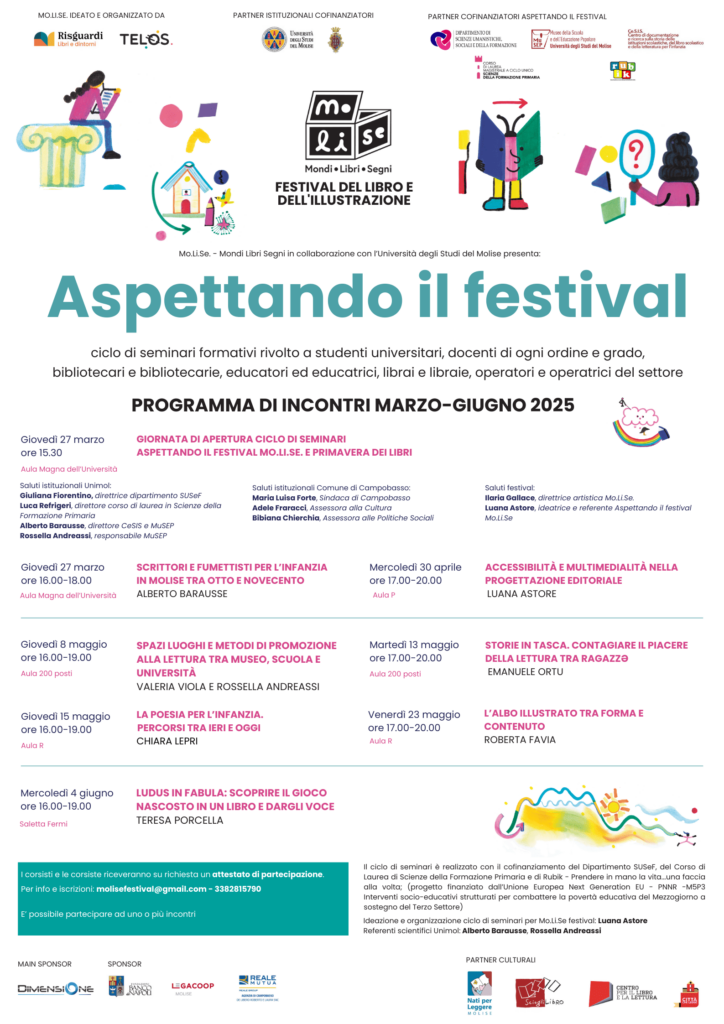 Un’anticipazione speciale del festival sarà rappresentata dal ciclo di seminari formativi per studenti universitari, docenti e operatori del settore “Aspettando il Festival”, realizzato in collaborazione con l’Università degli Studi del Molise e curato da Luana Astore, con inizio il 27 marzo 2025.