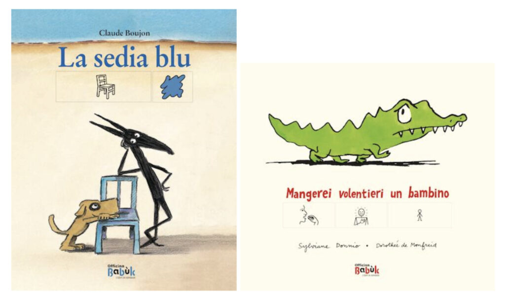 Arrivano in libreria l’8 settembre i primi due albi illustrati firmati dal nuovo marchio editoriale Officina Babùk: due amatissimi titoli del catalogo Babalibri, La sedia blu, scritto e illustrato da Claude Boujon (trad. Maria Marconi), e Mangerei volentieri un bambino, di Sylviane Donnio e Dorothée de Monfreid (trad. Federica Rocca), che presenteranno per la prima volta il testo in simboli, secondo le tecniche della Comunicazione Aumentativa Alternativa (CAA), la cui versione è stata curata da Enza Crivelli e Sante Bandirali.