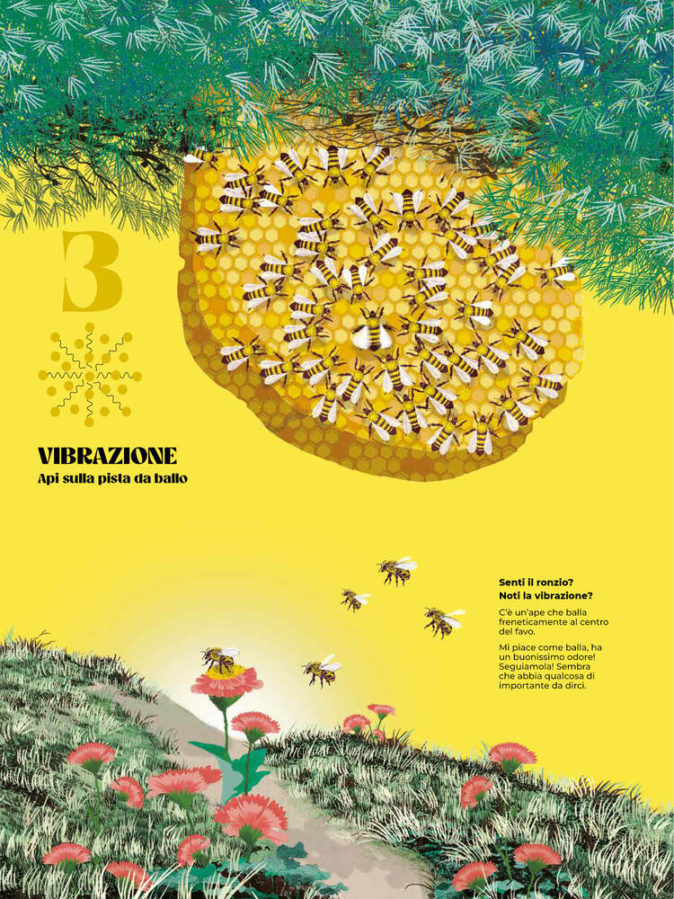 Illustrazione dopo illustrazione, potremo soffermarci sulle strategie migratorie delle oche, con le loro cerimoniose formazioni a V che consentono di risparmiare energia; sul magico volo degli storni, capaci di formare delle strane nubi aeree; sulle danze vibranti e super organizzate delle api; sulle spirali create dalle sardine e sui loro spettacoli di nuoto sincronizzato; sulle “strade” tracciate dalle colonie di formiche e infine sulle lunghe file dei pinguini con le loro impeccabili piroette “in smoking”.
