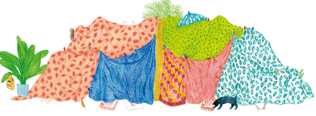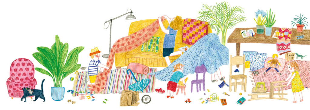 Cosa c’è di più divertente di costruire una capanna improvvisata, fatta di lenzuola e mollette, cuscini raccolti da tutta la casa, sedie e divani, e quello che capita? Quando il rifugio è pronto, è come un forte inaccessibile, abitato solo dai bambini. I grandi, però, sono curiosi e chiedono il permesso di entrare: una mamma, poi un ciclista, una signora col trolley e altri ancora… Ma come faranno a starci tutti?