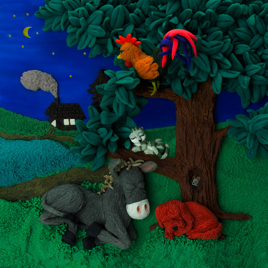 Anche le tavole di Antonietta Manca, illustratrice che lavora con plastilina, oggetti ed elementi naturali, facilitano la lettura rendendo emozioni e intenzioni dei personaggi immediatamente riconoscibili e comprensibili qualunque siano l’età e le capacità dei lettori: ecco i quattro amici che spaventano i briganti con terribili beccate, artigli sguainati e zoccoli “volanti”, ed eccoli poi che riposano sereni e beati nella loro nuova casetta. Ogni illustrazione è chiara e facilmente decodificabile in autonomia, ma anche spiritosa e divertente da commentare insieme.