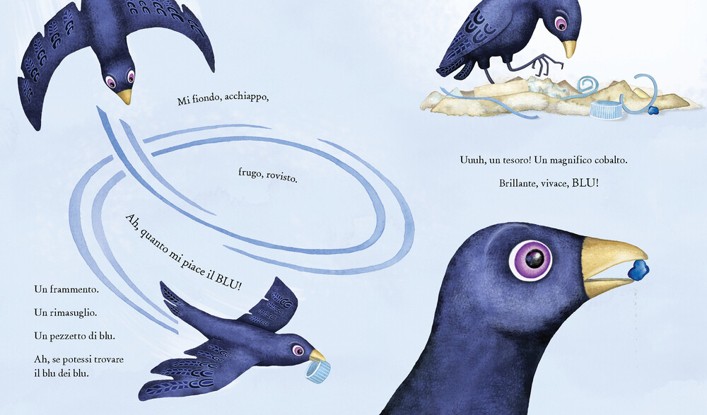 Il testo, musicale, espressivo e dal ritmo serrato, segue i movimenti e il volo del protagonista, trascinando il lettore in una narrazione avvincente. Grazie a sapienti giochi grafici e a scelte di impaginazione originale, siamo tutti portati a planare sulle pagine e a salire e scendere in velocità per rincorrere il BLU. Una narrazione fresca e “interattiva” anche perché l’autrice invita bambini e bambine a calarsi nel ruolo dell’uccello giardiniere e a ritrovare, tra le illustrazioni, i vari oggetti che fanno parte della sua speciale collezione. Un albo esteticamente raffinato, dalle immagini morbide e armoniose, che porta a riflettere sulla bellezza della natura, sul nostro stare al mondo e su quei legami che ci fanno sentire completi.
