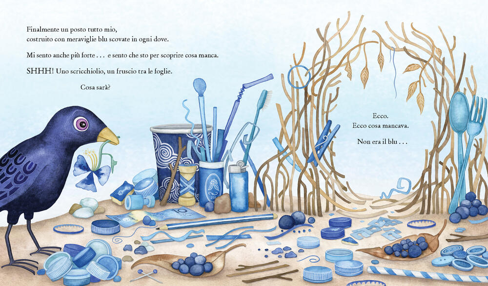 Da scrupoloso e attento collezionista di blu, l’uccello giardiniere seleziona con grande cura tutti gli oggetti che trova. Li ordina per bene, li dispone in file, sa come valorizzare i pezzi unici, fino a comporre una collezione ricca di bellezza e di varietà. Avvinti dalla grazia e dall’armonia delle tavole di Aura Parker, quasi non ci si accorge che fra rimasugli e frammenti vari affiorano soprattutto tappi, mollette, fermagli, cannucce. A ben guardare, i ritrovamenti del piccolo volatile sono tutt’altro che naturali, e a “luccicare” sono perlopiù scarti di plastica e spazzatura. È il grido d’allarme ecologista che l’autrice lancia a tutti noi, una dichiarazione d’amore verso la tutela ambientale che non ha bisogno di parole, ma che si manifesta silenziosamente in tutta la sua evidenza, illustrazione dopo illustrazione.