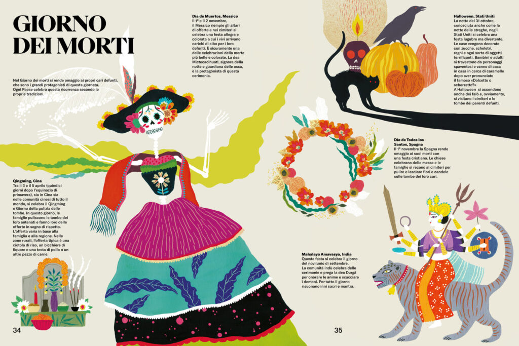 Un albo che esplora la tematica secondo angolature varie e affascinanti, soffermandosi anche sulla celebrazione del Giorno dei morti, che ci mostra i riti funebri delle diverse culture del mondo – tra fuochi purificatori buddisti, sepolture cristiane e perfino rituali degli uomini di Neanderthal – e dà un volto alle divinità che presiedono questo universale rito di passaggio nelle varie culture.
