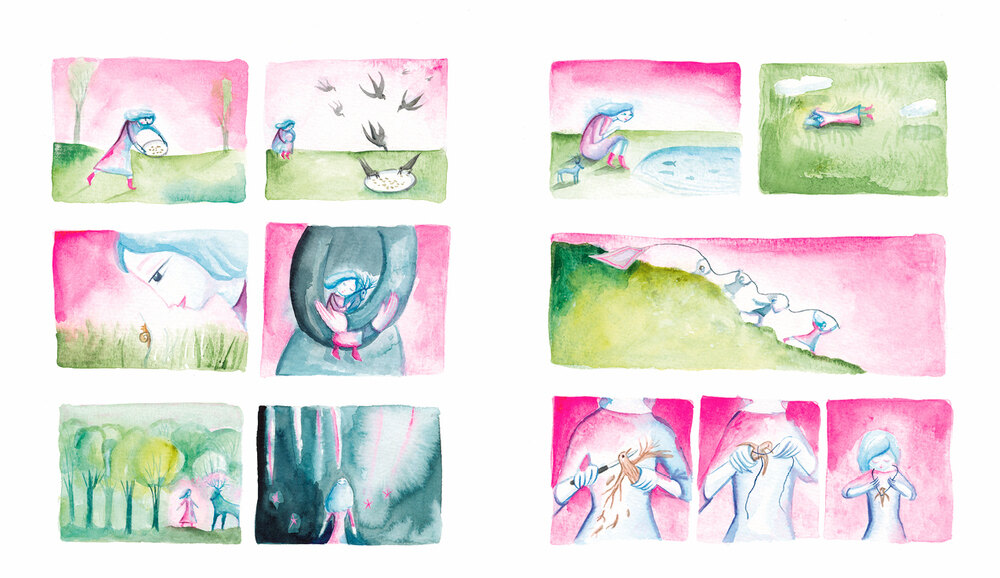 “Il mio modo di dipingere è cambiato radicalmente negli ultimi anni: ora il gesto è più fluido, veloce, emozionale. Proprio seguendo un sentiero più emotivo si è imposta la palette di colori utilizzata in questo albo, nella quale spicca un rosa vivace e intenso molto difficile da rendere su carta stampata, ma che grazie a una grande attenzione e cura nella produzione dell’albo siamo stati in grado di riprodurre fedelmente.” – Bimba Landmann