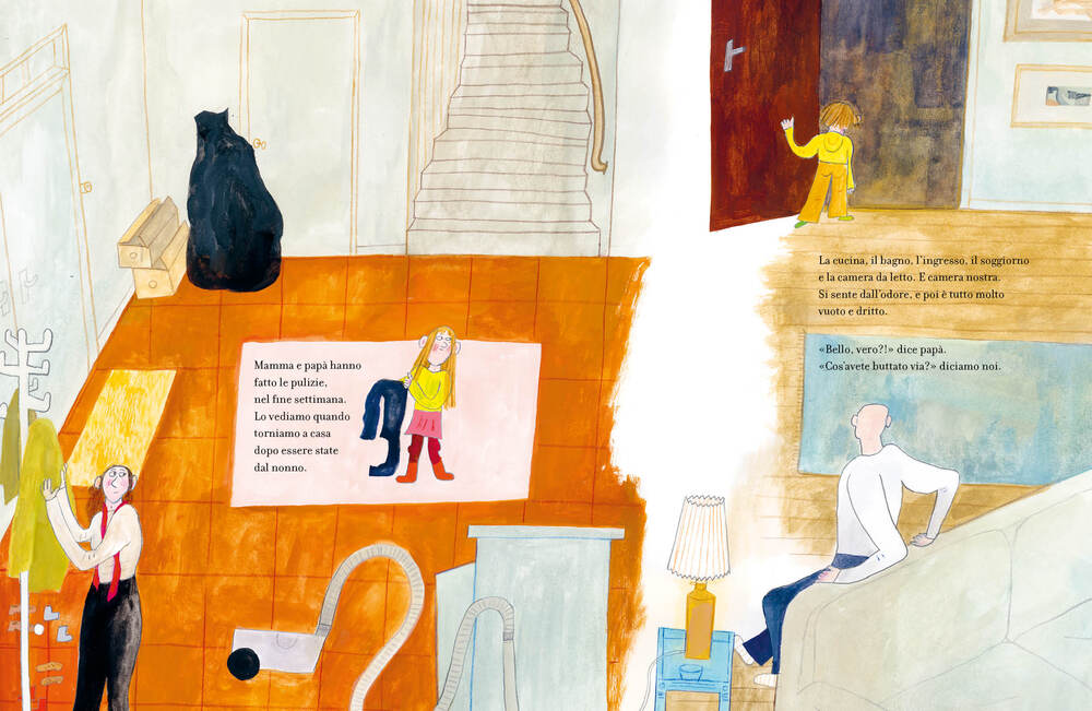 Quando le bambine tornano a casa, dopo aver trascorso il weekend dal nonno, capiscono subito che qualcosa non va: è tutto troppo vuoto, troppo ordinato… e profuma di pulito. I genitori dicono di aver solo spolverato, ma nell’ingresso c’è un grosso sacco nero pieno di “cianfrusaglie rotte e inutili”.