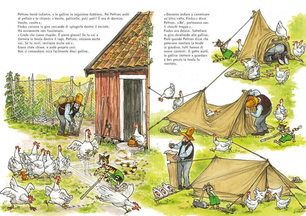 Rovistando in soffitta, Pettson ritrova una vecchia tenda da campeggio e racconta al gatto Findus quanto fosse bello dormire sotto le stelle, specialmente dopo una lunga camminata in montagna. Findus è entusiasta all’idea e vorrebbe provare anche lui, così i due si incamminano, tenda e sacco a pelo in spalla, verso il lago vicino casa, intenzionati a passare una piacevole serata in camping. Quando però anche le galline dicono di voler partecipare, tutto si fa un po’ più complicato e inizia una lunga serie di imprevisti… Dopo aver quasi pescato il luccio più grande del mondo, finalmente Pettson e Findus crollano a dormire, e cosa importa se la tenda è piantata soltanto in giardino? Il vicino di casa avrà senz’altro qualcosa da raccontare.
