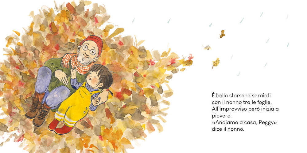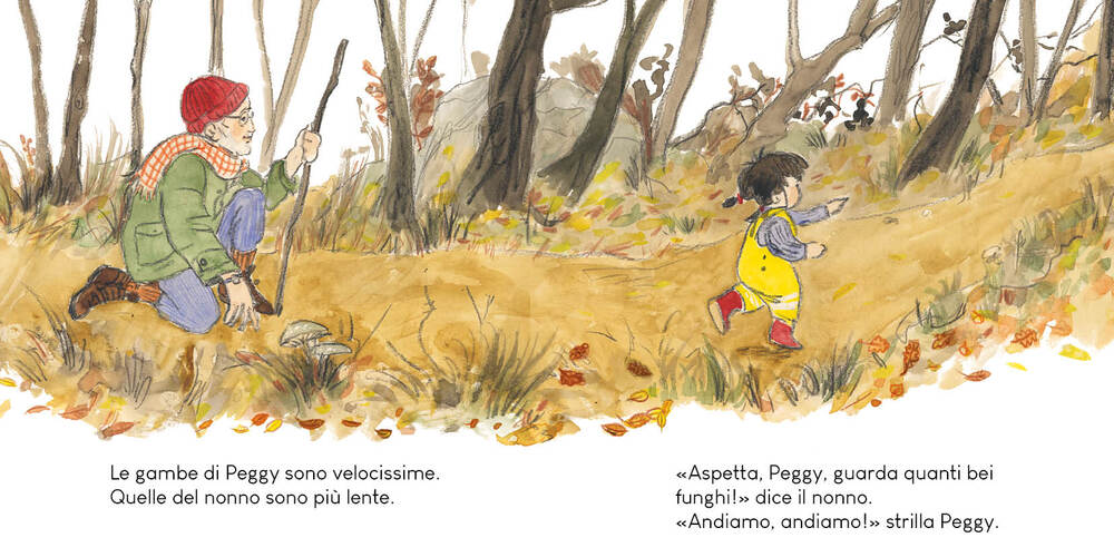 Peggy e il nonno oggi vanno a fare una passeggiata nel bosco. Ci sono così tante cose da vedere! Le gambe di Peggy sono velocissime, quelle del nonno invece vanno molto più lentamente. “Andiamo, andiamo” ripete Peggy, eccitatissima da tutte queste esplorazioni. Quando però comincia a piovere e la stanchezza si fa sentire, sarà una fortuna poter contare sulle lunghe gambe lente del nonno, che la riportano sempre a casa.